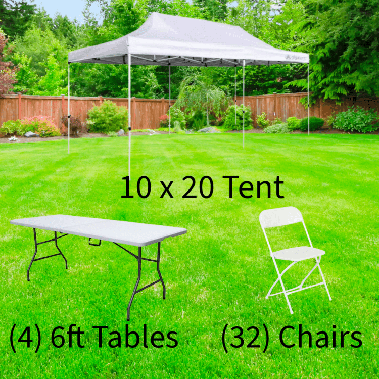 Keep your gathering comfortable and covered with this 32 Person Tent Package. A simple, practical setup that gives your guests shade and a place to sit. The package centers on a 10 x 20 pop-up tent that sets up quickly and provides protection from sun or light drizzle. Paired with a 6' rectangular table and a standard folding chair, this package includes the right mix of shelter, surface, and seating to accommodate up to 32 people. Ideal for backyard parties, vendor booths, registration stations, or sheltered seating areas.