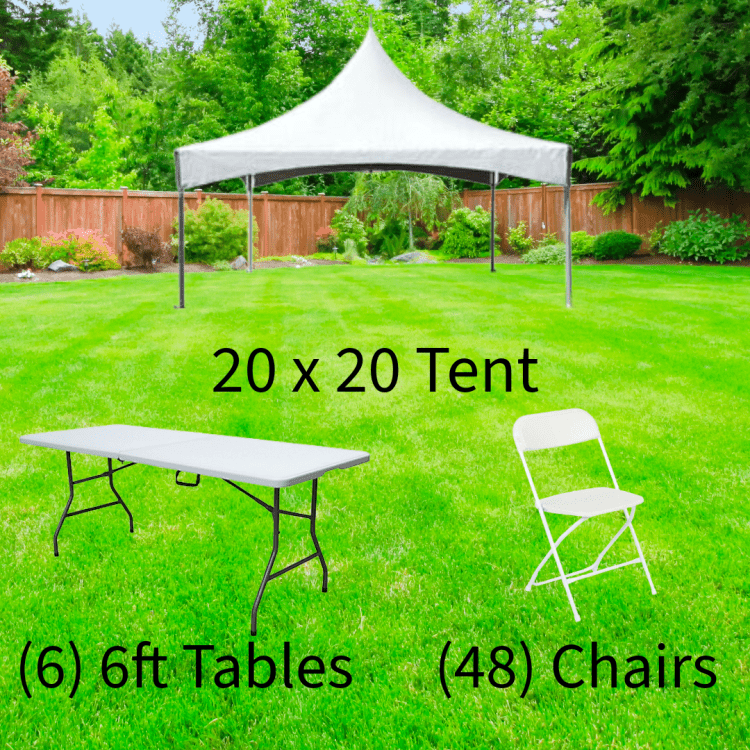 20 x 20 High Peak Frame Tent48 Person Tent Package:20 x 20 High Peak Frame Tent1Dropdown13154057_31178110100 Our 20'x20' high peak tents add a stylish touch to any event. Featuring a unique peaked design with no center poles, they provide a spacious, open interior. Perfect for weddings, corporate gatherings, graduations, and more. Made from high-quality, block-out material, our tents offer excellent shade to keep guests cool.